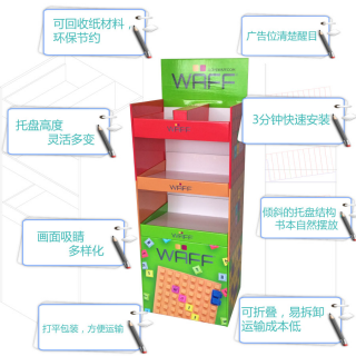 2.落地式展架,托盤顏色根據(jù)客戶的產(chǎn)品顏色進(jìn)行印刷,每類產(chǎn)品分開展示;傾斜的托盤結(jié)構(gòu)可以保證書本在展示過程中保持正面且不會滑倒;簡單大氣的客戶logo印刷在頭牌處,彰顯客戶品牌;