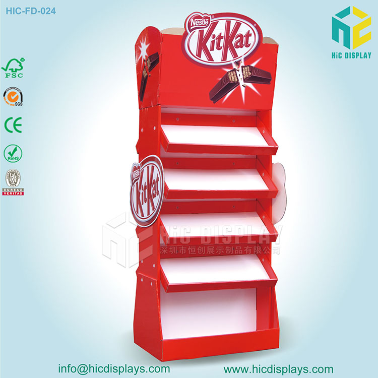上圖就是雀巢旗下的Kitkat巧克力。這個(gè)展架的結(jié)構(gòu)也屬于層式落地展示架,但是根據(jù)客戶的要求,我們把展示架的托盤設(shè)計(jì)成向下傾斜的托盤,而且整個(gè)展架的風(fēng)格也是讓人耳目一新。從產(chǎn)品logo中發(fā)現(xiàn)紅色的元素于是我們?cè)谡故炯苌喜捎昧舜蠹t這種顏色。成功的點(diǎn)亮了屬于Kitkat巧克力的獨(dú)特魅力,無(wú)論放在哪個(gè)賣場(chǎng)上都是格外的吸睛。