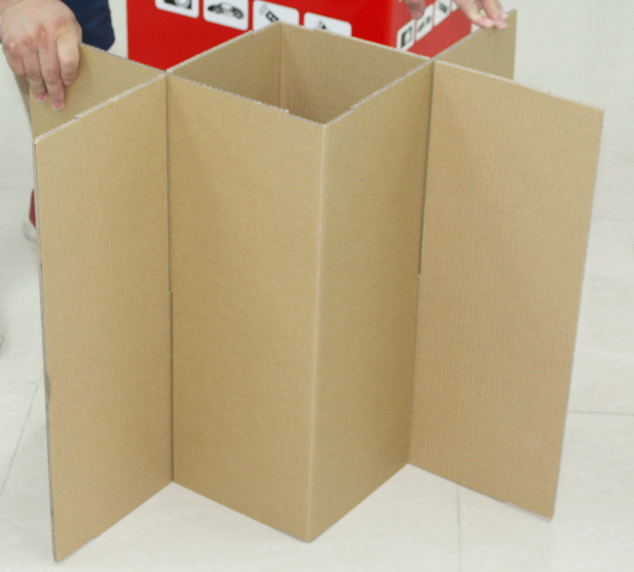 或許你們會(huì)覺(jué)得吃驚,為什么看起來(lái)簡(jiǎn)簡(jiǎn)單單的堆頭可以承受這么高的重量呢?其實(shí)在堆頭內(nèi)部,有我們看不見(jiàn)的刀卡。所謂的刀卡就是用7mm厚的瓦楞紙?jiān)O(shè)計(jì)成兩塊紙板交叉拼合而成的支撐卡。沒(méi)錯(cuò)就是這種類型。在堆頭里面有非常多這樣的刀卡。所以達(dá)到了非常高的承重。